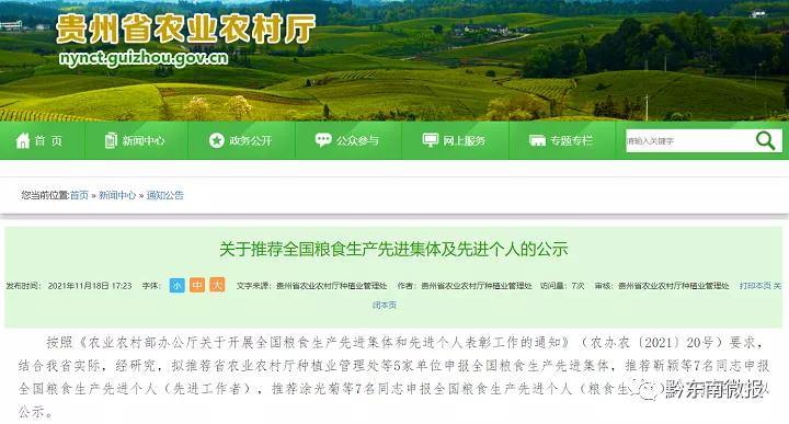11月18日,贵州省农业农村厅发布《关于推荐全国粮食生产先进集体及先进个人的公示》。其中拟推荐5家单位申报全国粮食生产先进集体,7名同志申报全国粮食生产先进个人(先进工作者),7名同志申报全国粮食生产先进个人(粮食生产者)。