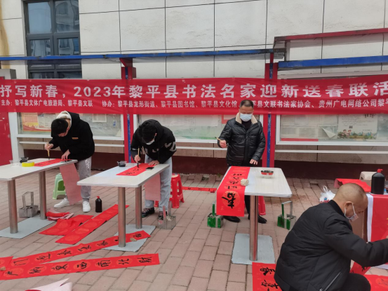 岁末年初,春节将至,为丰富人民群众文化生活,让黎平人民享受文化惠民的成果,营造祥和、喜庆的节日氛围,1月17日上午10:00,县文体广电旅游局、县文联与县图书馆、县文化馆、县文联书法家协会开展了“我们的中国梦——文化进万家”抒写新春,2023年黎平县书法名家迎新送春联活动。