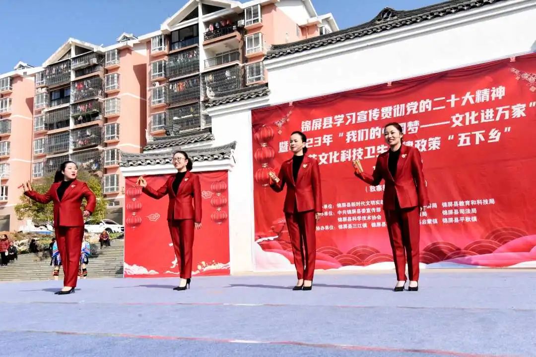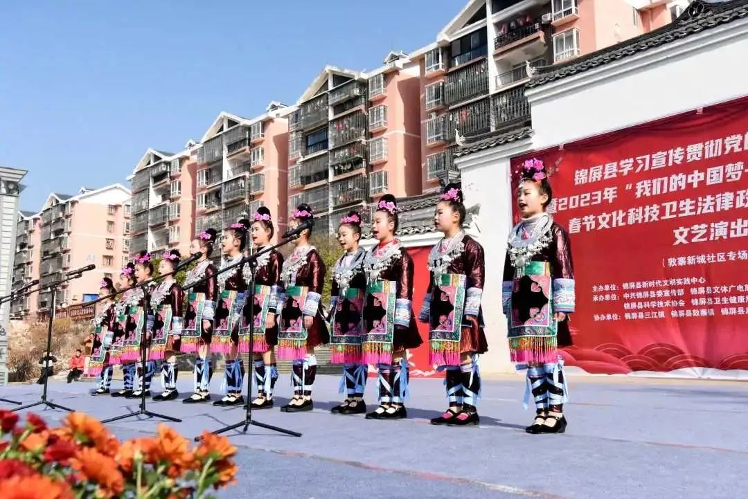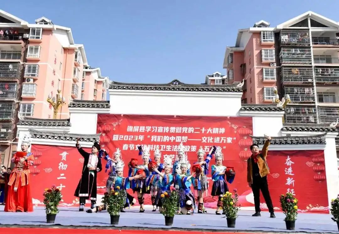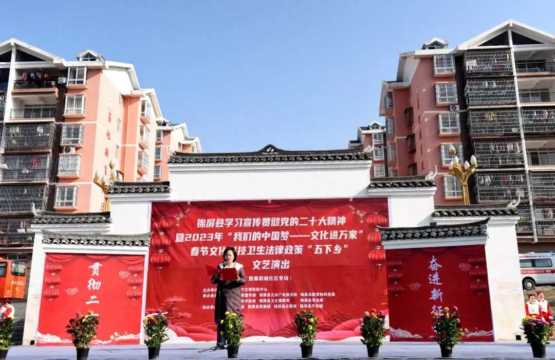 2023年1月29日,由锦屏县新时代文明实践中心主办,中共锦屏县委宣传部、锦屏县文体广电旅游局、锦屏县教育和科技局、锦屏县科协技术协会、锦屏县卫生健康局、锦屏县司法局承办,锦屏县三江镇、敦寨镇、启蒙镇、平秋镇协办的锦屏县学习宣传贯彻党的二十大精神暨2023年“我们的中国梦——文化进万家”春节文化科技卫生法律政策“五下乡”文艺演出活动在敦寨镇新城社区隆重开幕,中共锦屏县委常委、宣传部长、统战部长吴艳出席活动并致辞。