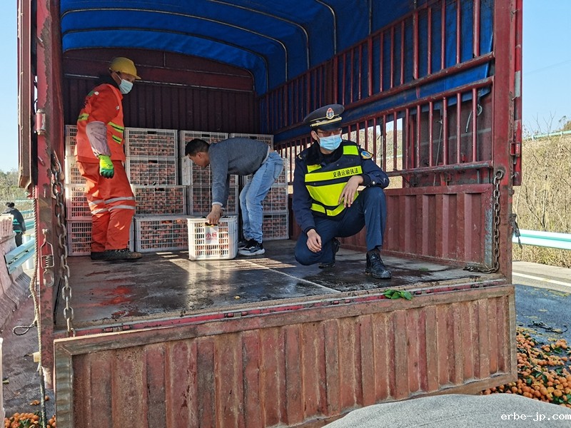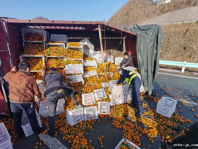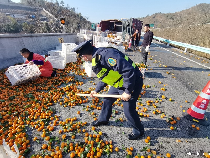 到达现场后,只见一辆小型货车“横躺”在高速公路匝道上占据了大部分路面,执法人员立即对事故现场进行渠化。该车运输货物为砂糖橘,由于车辆侧翻导致货物散落在路面以及边坡各处。经过渠化,清理出部分被占用路面,让小型车辆可暂时通行后,执法人员开展现场勘验。经执法人员询问得知,驾驶员从省外长途运输约8.5吨砂糖橘前往铜仁,途经S62余册高速K88+000青虎冲互通匝道因为着急赶路车速过快,加之操作不当导致货车侧翻,车上有驾驶员和货主2人,当时都系了安全带,未造成人员受伤。为确保事故得到及时有效处置,减少当事人的损失,执法人员联合高速公路“一路多方”工作人员迅速开展救援,同时通知驾驶员联系货车前来转运货物。为减少转货时间,交通执法人员协助驾驶员捡拾散落的砂糖橘,同时安抚驾驶员和货主的情绪,确保救援顺利开展。经过三个多小时的紧张救援,侧翻车辆拖离、货物转运完毕,事故处理完成,路面恢复正常通行。货主及驾驶员再三对“一路三方”救援人员道谢,并表示以后会更加谨慎驾驶。