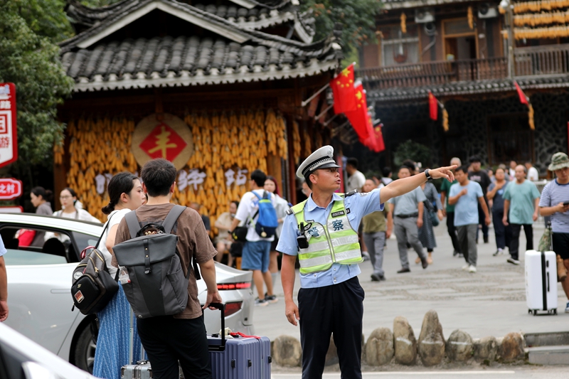 国庆中秋假期,对于大多数人来说是举家出游的好时机,凯里香炉山、雷山西江“千户苗寨”、镇远古城、丹寨万达小镇、黎平肇兴等景区景点皆迎来了游客高峰。为全力保障广大游客的出行安全,各交警大队加大对景区道路的巡逻管控,为广大游客创造安畅有序的出游环境。同时,执勤民辅警用温情守护着每一个需要帮助的群众,用实际行动证明,他们不仅是维护交通安全的“卫士”,更是服务群众的“及时雨”。10月7日下午,在雷山县西江镇营上十字路口,县公安局交警大队民辅警正在对过往车辆进行有序引导,交通秩序井然有序。为应对返程高峰,大队在各路口增派人员做好现场疏导,缓解高峰时段出现的问题,提升车辆通行效率。“国庆中秋假期期间我们全员在岗,实行‘定点值守+动态巡逻’模式,在西江收费站、景区出入口、营上十字路口等点位增派警力,并组建了三支摩托化快反小队,确保快速响应。”雷山县公安局交警大队辅警李正东介绍说。
