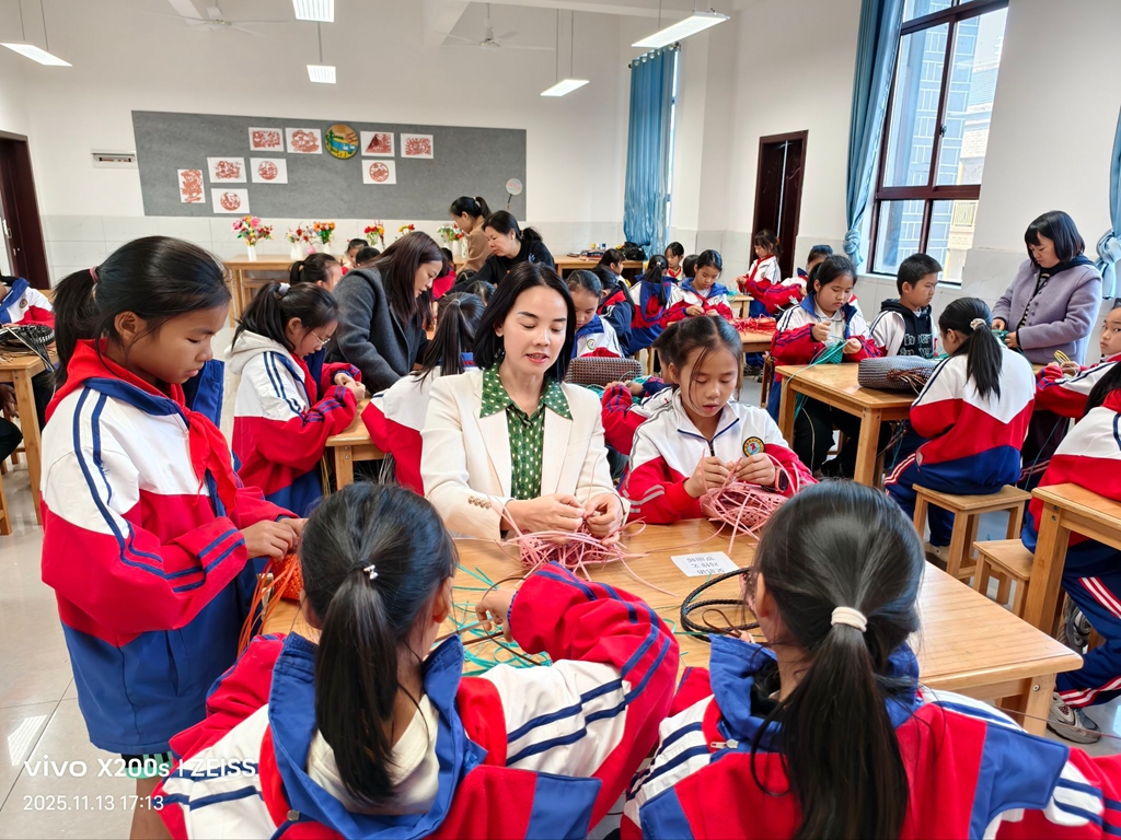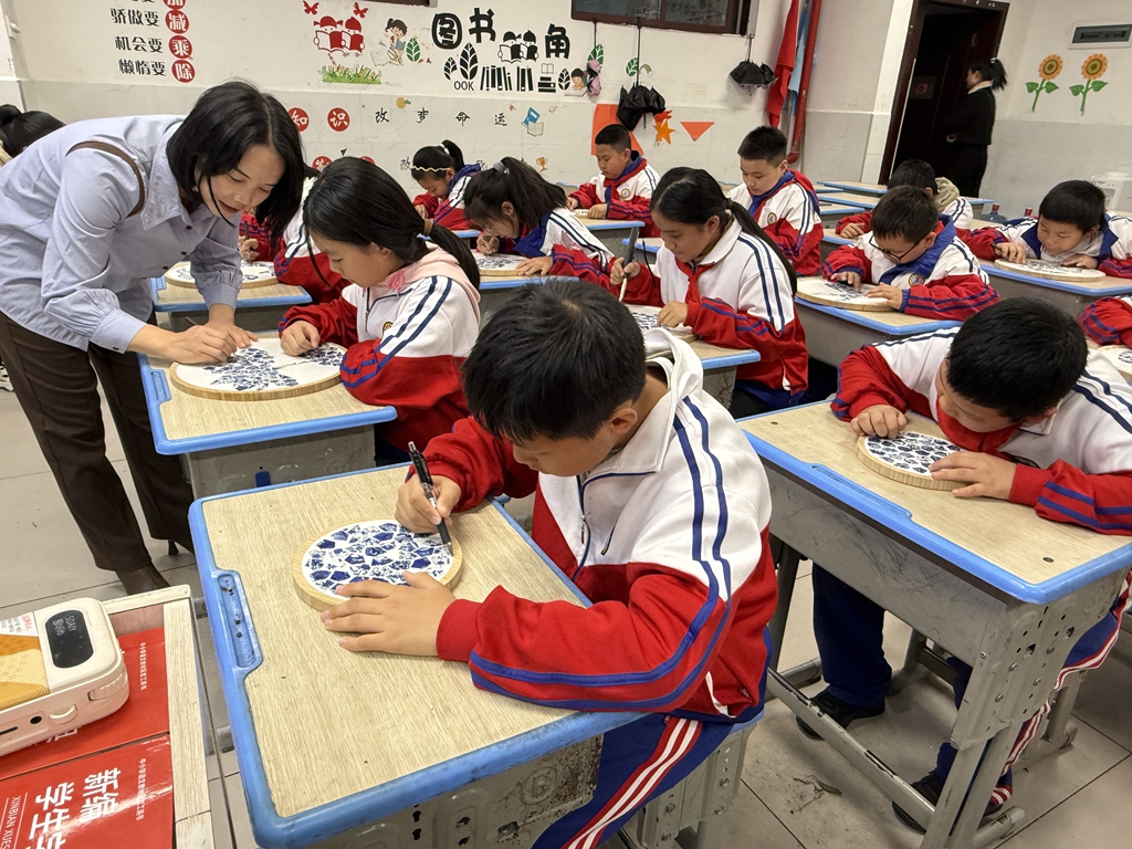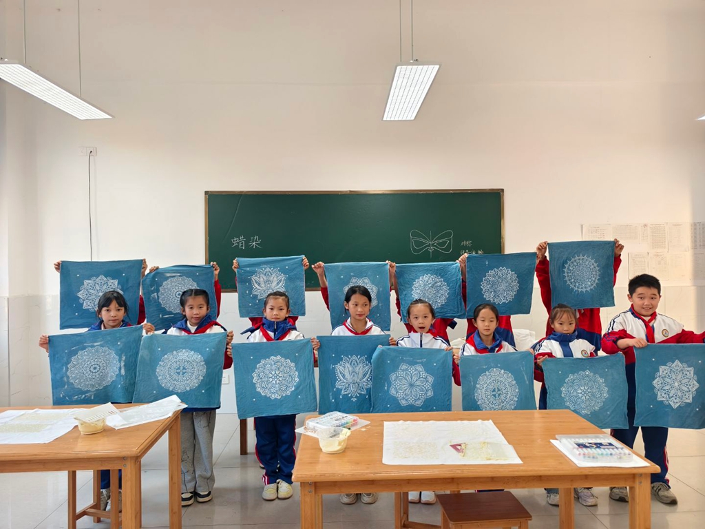 扎染的蓝布浸过染料,晾在走廊像一片刚被风吹过的云;孩子们伏在桌前,指尖流转间,将纸张幻化成细腻的图案。