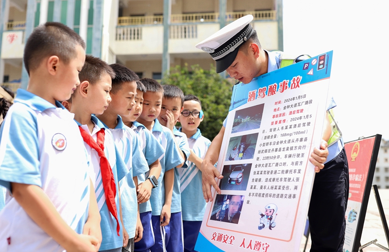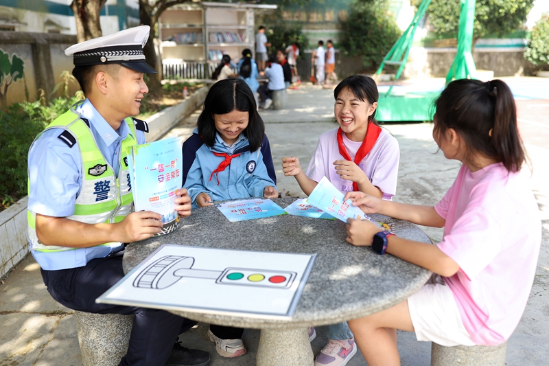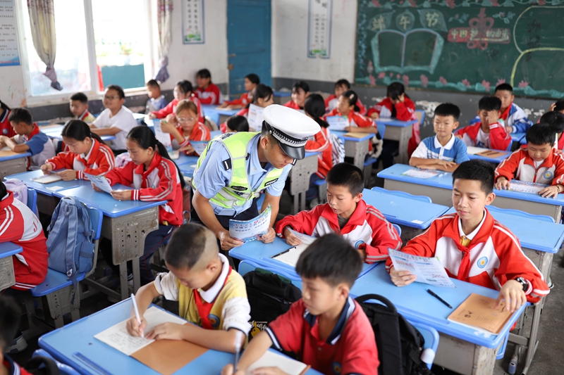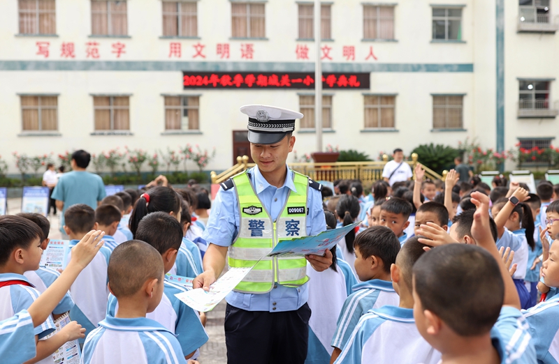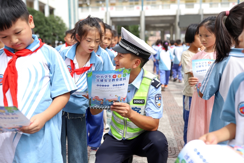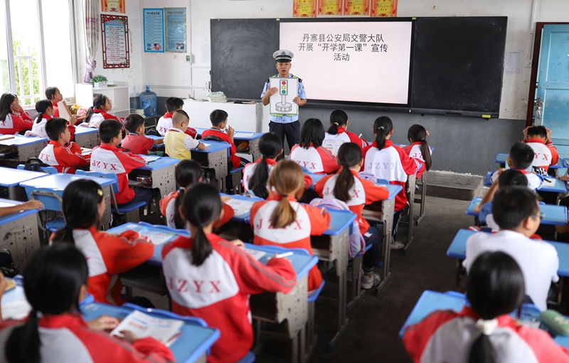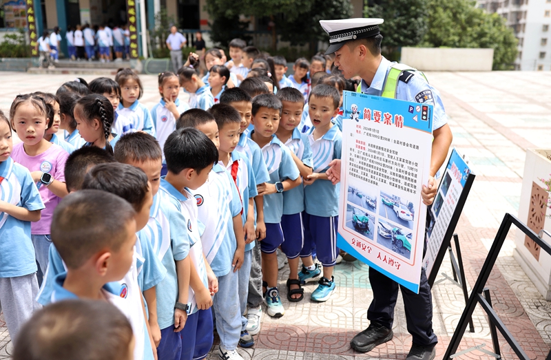 9月2日,丹寨县公安局交警大队组织宣传民警走进辖区中小学校园,结合开学典礼向广大师生宣传普及道路交通安全知识,以增强学生们的法律观念与自我保护意识。(陆德华 摄)
